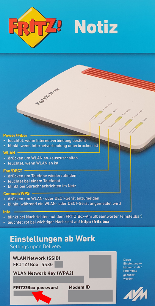 Wenn du das Kennwort zur Anmeldung an der FRITZ!Box-Benutzeroberfläche nicht geändert hast, findest du es unter dem Gehäuse der FRITZ!Box oder auf der beiliegenden Notiz-Karte abgedruckt. Beachte, dass es sich nicht um den WLAN-Netzwerkschlüssel handelt.