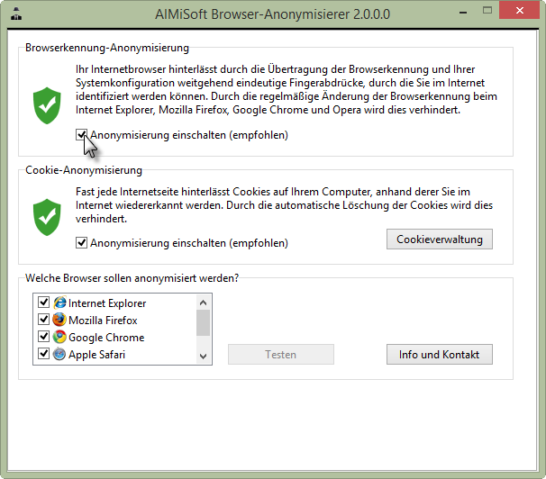Der Browser-Anonymisierer verändert bei jedem Browser-Neustart die Browserkennung, dadurch wird der Fingerabdruck für die Wiedererkennung unbrauchbar. Das Programm lässt sich mit zwei Mausklicks konfigurieren und agiert dann automatisch im Hintergrund.